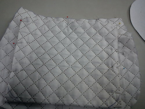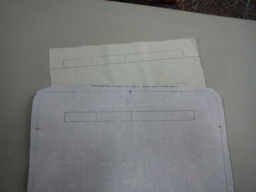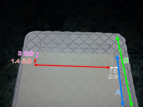 3. 如圖上面預留3公分,左右各留1.5公份,畫上口袋記號,然後用珠針對準表布裡布口袋位置別上表珠針。