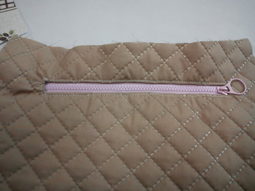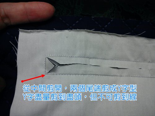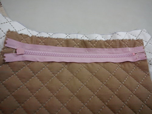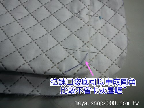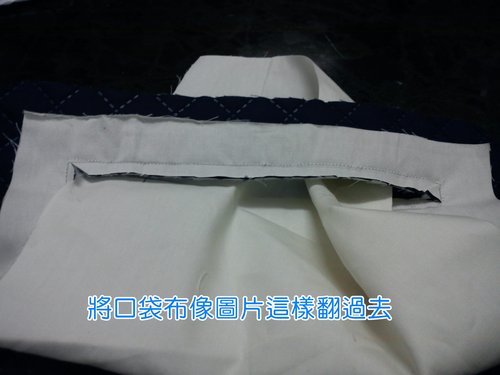 9. 拉鍊縫好後將拉鍊口袋布-->如下圖往上翻對齊上面後,以將ㄇ字型三個邊車縫起來。
