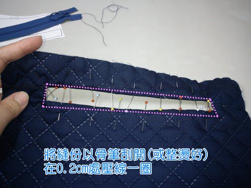7. 將縫份以骨筆刮開(或整燙好),在以0.2~0.3cm壓線一圈。